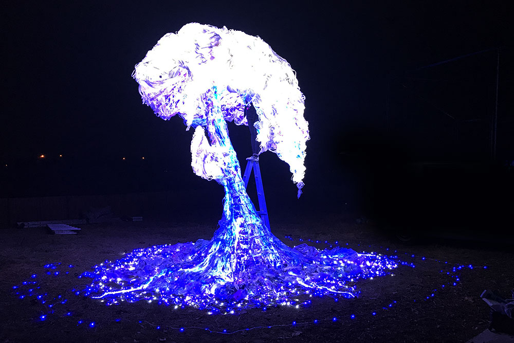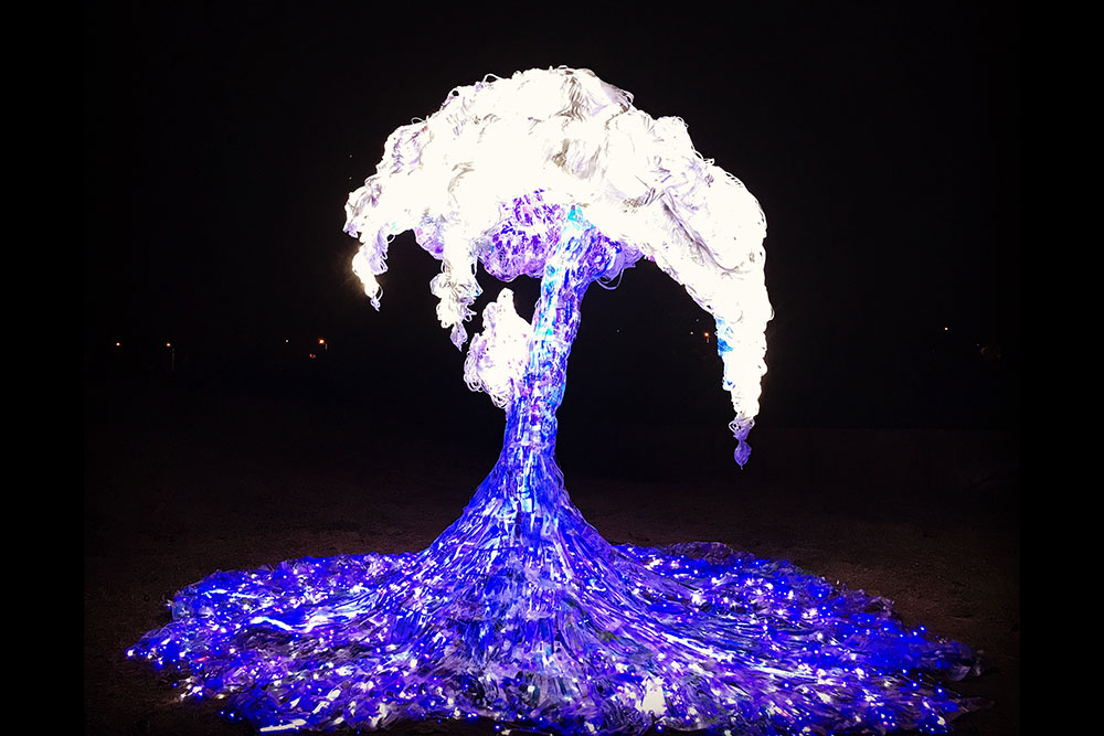 「星光潮來 Dreamy Tide」,用回收塑膠袋、Led燈條做成可以飄逸在空中的海浪,讓人掀起來躺在其中看裡面的燈光投射,感覺好像在海裡,也好像在星空下感受塑膠袋飄揚,或有人觸碰也如海浪聲一般。